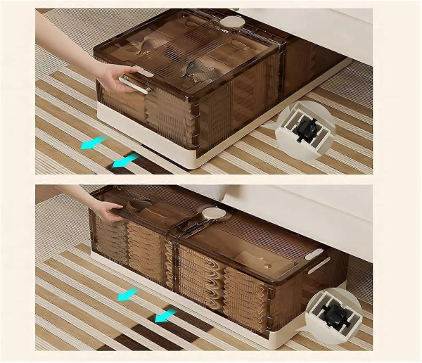 Uitați de căratul cutiilor grele! Datorită rotițelor integrate, tot ce trebuie să faceți este să împingeți ușor - cutia va aluneca fără probleme de sub un pat sau o canapea joasă.