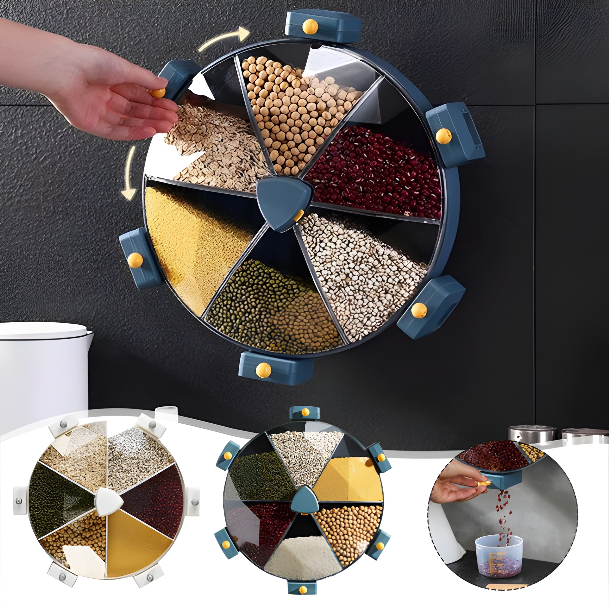 Datorită depozitării inteligente pe perete, economisiți spațiu prețios pe blatul de bucătărie. Totul este clar organizat și ușor accesibil. Pur și simplu rotiți pentru a distribui exact cantitatea de care aveți nevoie. Rezultatul este un spațiu curat și organizat în care vă simțiți confortabil și mulțumit.